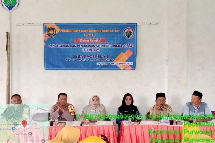 Kasi Pemberdayaan Masyarakat Kecamatan Purworejo, Purwaningsih, S.E., menghadiri kegiatan Pemberian Makanan Tambahan (PMT) dalam rangka pencegahan dan penurunan stunting tingkat desa tahun 2025. Kegiatan tersebut berlangsung pada Senin, 01 Desember 2025 pukul 09.00 WIB di Gedung Serbaguna Desa Pacekelan.